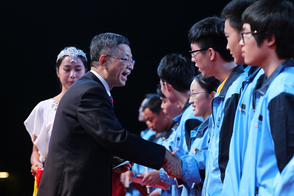 校党委书记王建华为获得新生奖学金的同学颁奖。