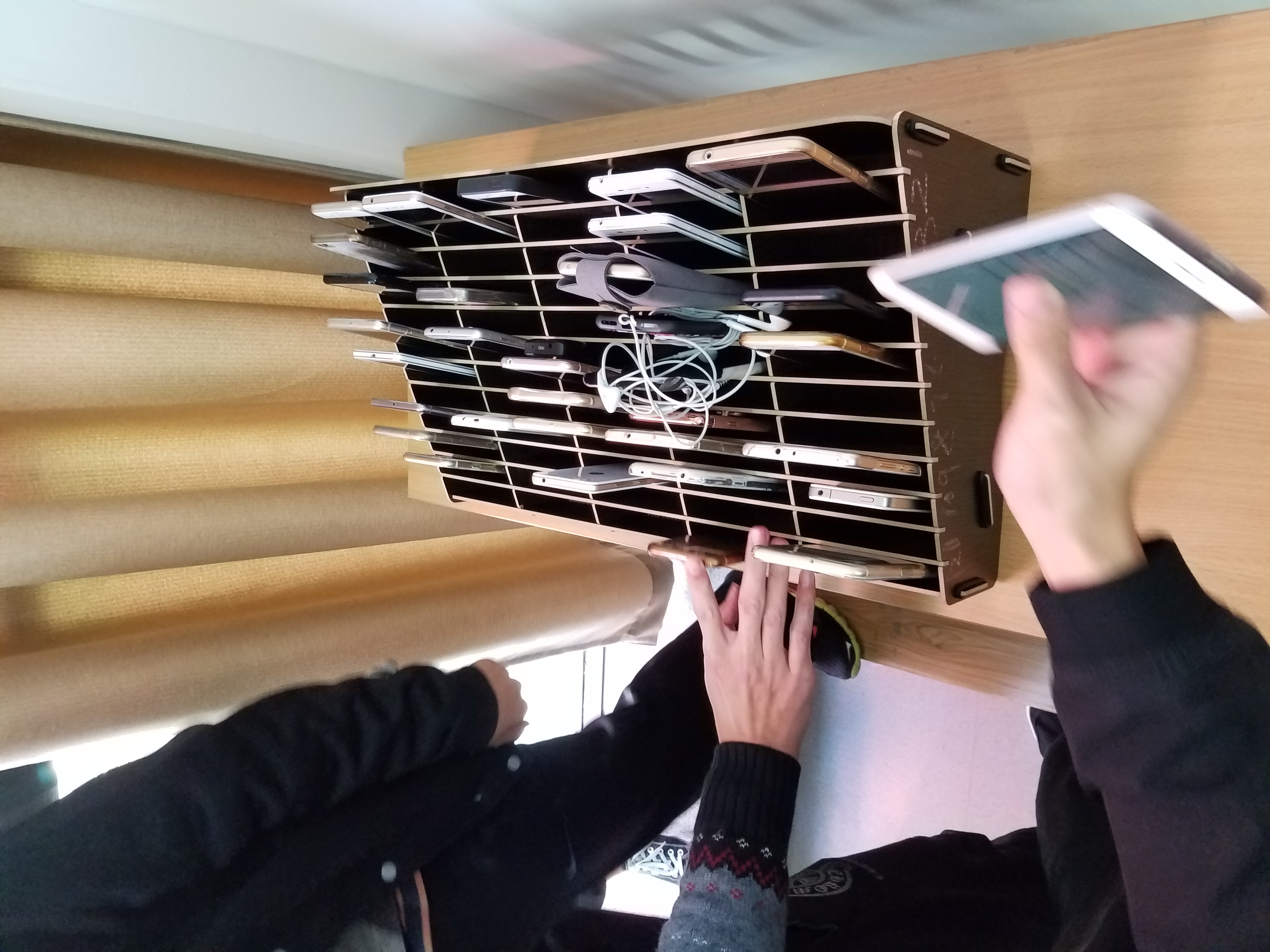 为此,DB彩票 为各班固定教室配备了色彩亮丽的手机收纳盒,期待有序过渡,最终达到自主选择、端正态度、增强课堂氛围的目的。