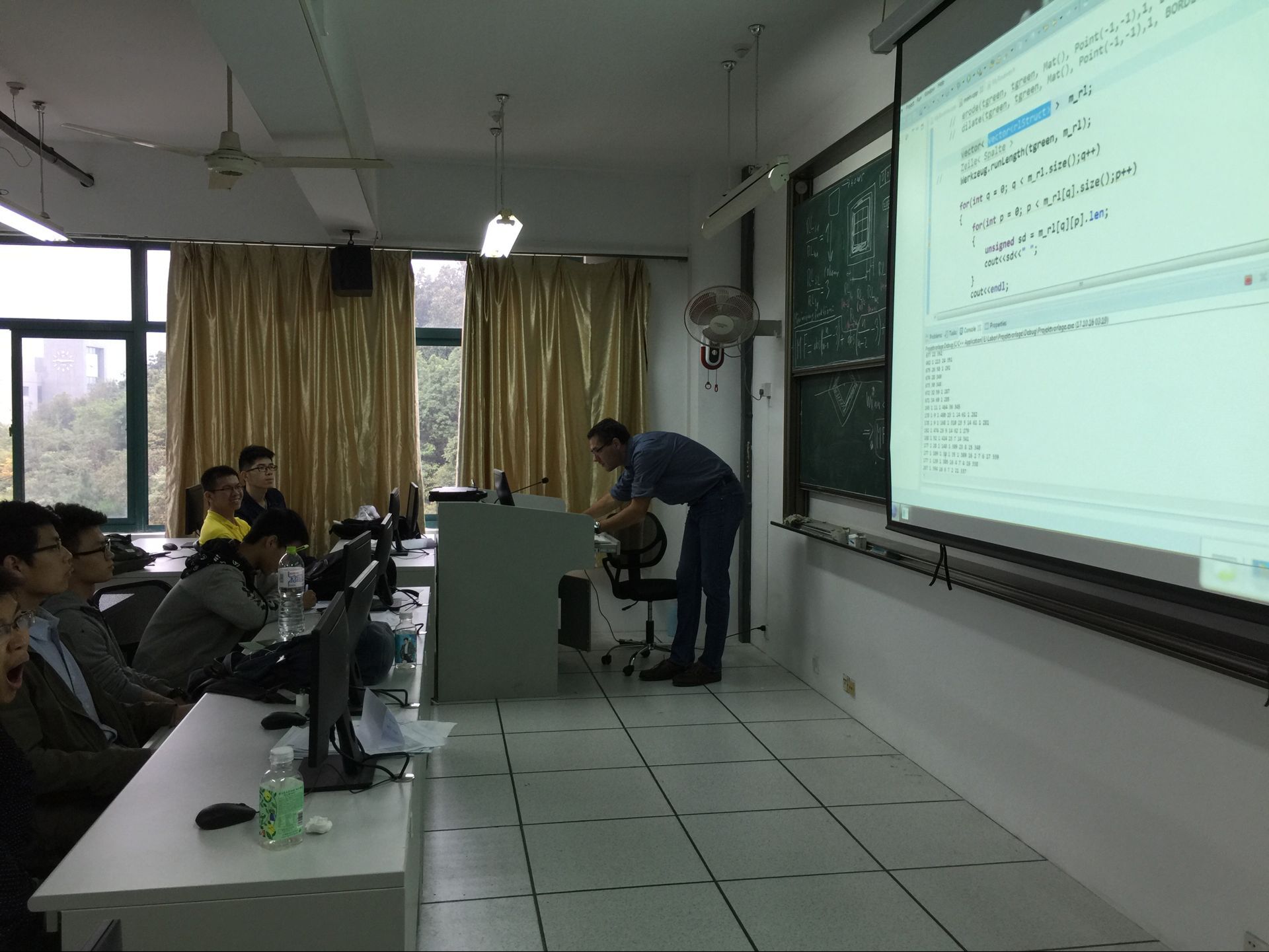 在实验教学部分,胡思曼教授和他的助手柯诺尔(Florian Johannes Knoll)先生,为同学们演示了OpenCV基本的用法,并且教同学们如何一步步的从图像中寻找并识别二维码。