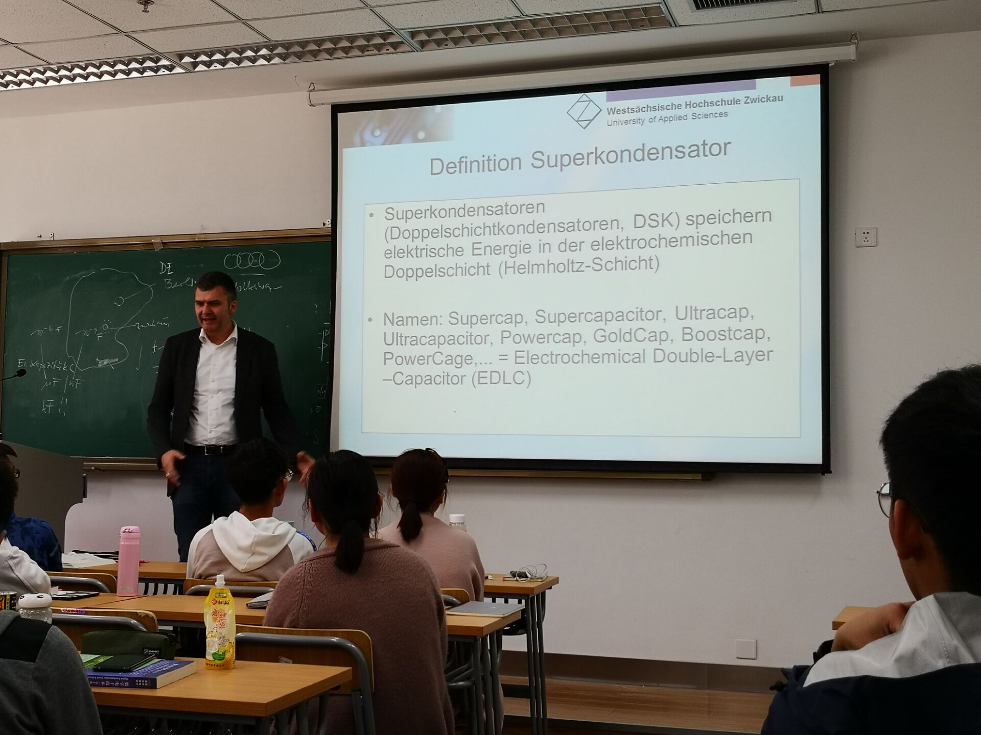 Lutz Zacharias教授简短介绍了Zwickau这座城市,以及Westsächsische Hochschule Zwickau的历史、专业等概况。两位教授由超级电容组Supercaps引入,展示了Westsächsische Hochschule Zwickau与Rutronik(儒卓力)公司有关超级电容组Supercaps的合作研究项目,讲解了有关的实验数据、原理、过程与结果。16级电气同学也在科研学习、两校合作项目方面与两位德国教授积极地交流。