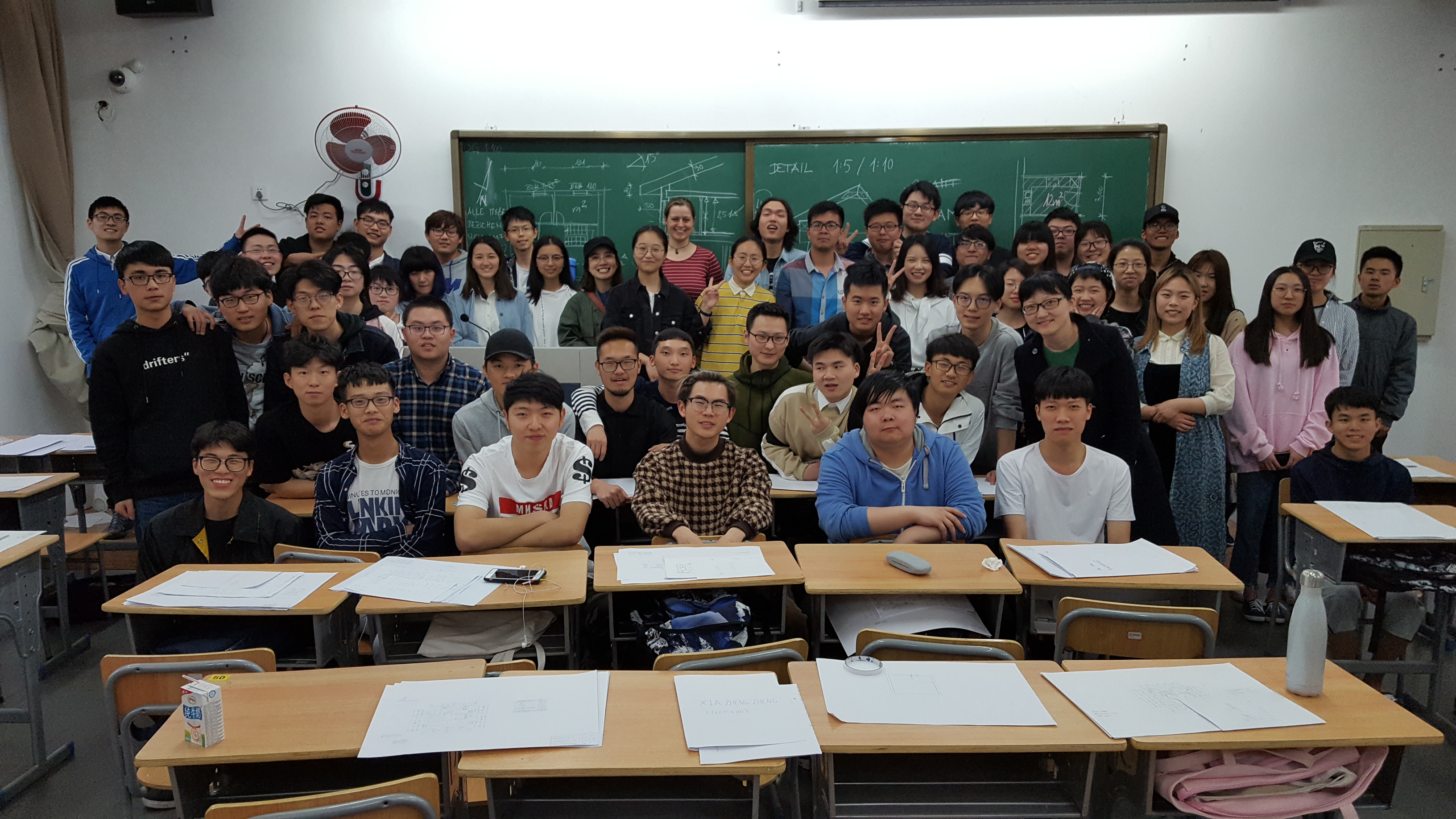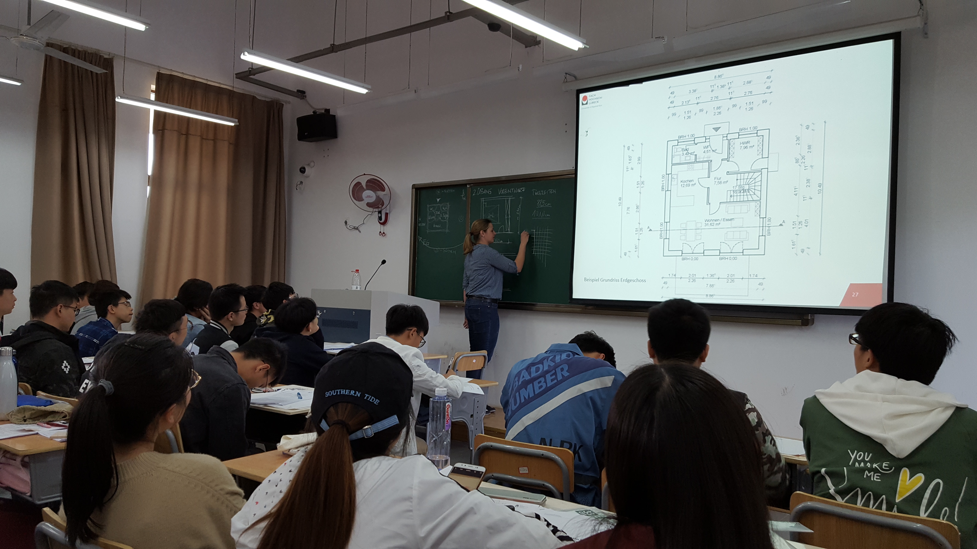 2018年4月9日,来自德国吕贝克应用科技大学的助教Jan Osten与Wiebke Martensen,为DB彩票 土木工程专业2016级学生讲授为期一周的建筑构造补充课程。在一周时间内,两位教师充分安排时间进行课程设计教学,以德国普通家庭住宅为例,从最基本的气泡图开始进行设计,逐步将学生心中想象的住宅实现为实际建筑施工图。