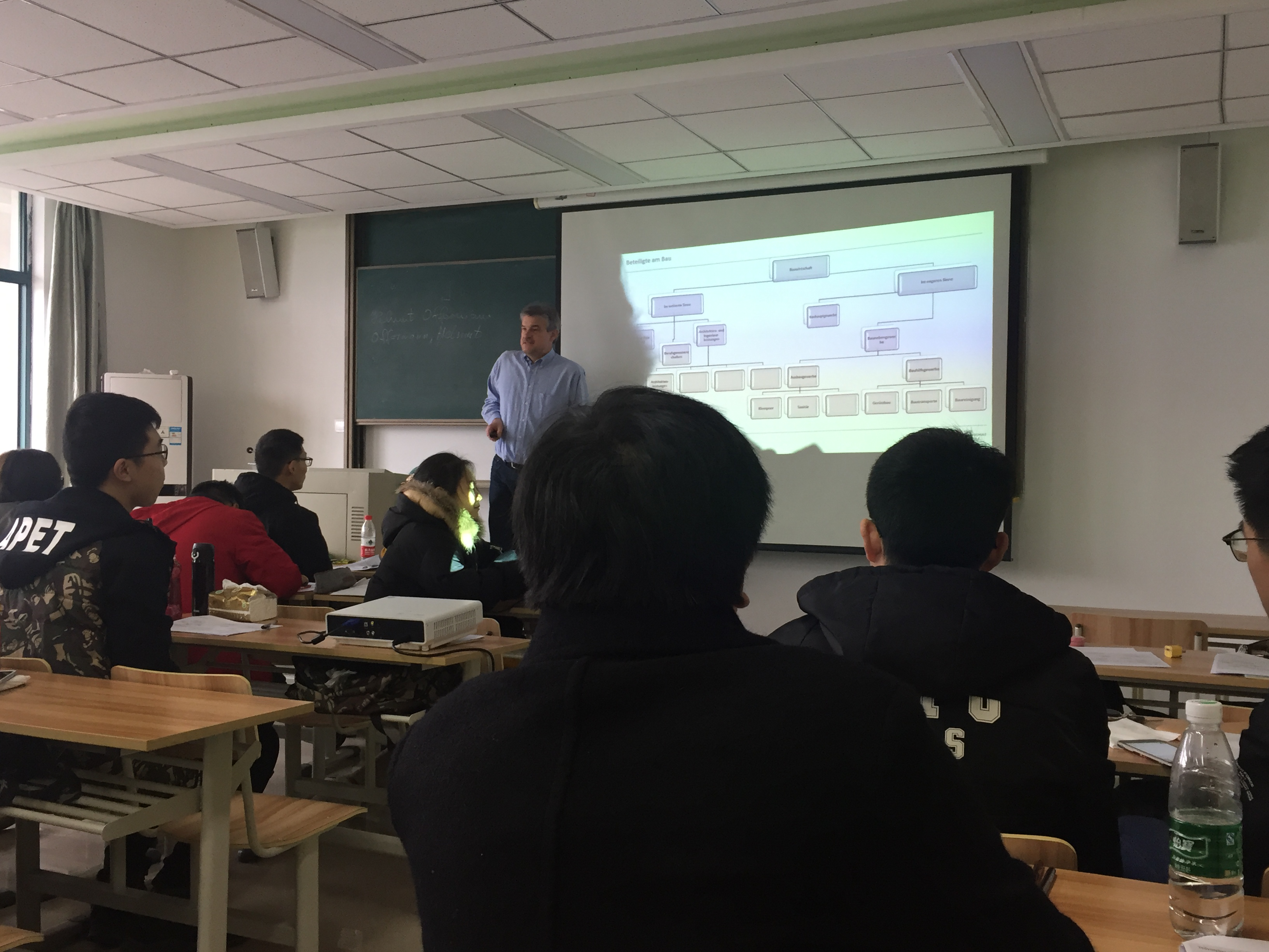 3月5日上午,德国吕贝克应用科技大学的Offermann教授开始为DB彩票 15级土木专业的同学讲授为期三周的《项目管理》课程,教学以课堂教学为主,并用视频播放的方式加深同学们的印象。这是15级土木专业的同学第二次接受德方教授的集中授课教学了。同学们对于长时间而又高强度的德语教学早就有了心理准备,在上学期就已经对德语专业名词进行了系统的学习,对于专业课的德语词汇有了一定的积累。上课也能更多地听懂教授的讲解。同学们上课认真听讲,下课能与教授积极探讨问题,同学之间互相交流疑问,教室里洋溢着浓重的学习氛围。