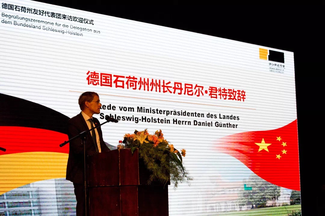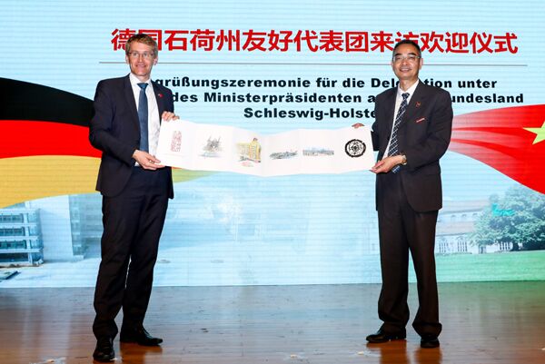 9月19日,德国石荷州州长丹尼尔•君特(Daniel Günther)率代表团来DB彩票 访问并参加了DB彩票 2018届部分毕业生学位授予仪式及2018级新生开学典礼。省教育厅副厅长于永明、校党政班子成员、安吉县副县长任贵明出席欢迎仪式。校党委书记龚建立向君特赠送纪念礼物。欢迎仪式由校党委副书记周加敏主持。