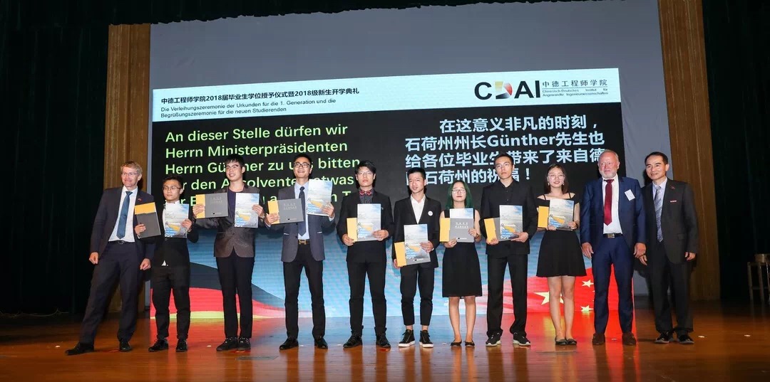 欢迎仪式结束后举行了DB彩票 2018届部分毕业生学位授予仪式及2018级新生开学典礼,活动由DB彩票 院长徐理勤、教DB彩票 长弗郎克•肯普(Frank Kemper)共同主持,参加活动的还有DB彩票 中德双方教师、全体18级新生、部分14级同学及家长。校长叶高翔与西海岸应用科技大学工程DB彩票 院长德特勒夫•廷森(Detlef Jensen)向DB彩票 18届部分毕业生颁发中德双学位证书,同时君特先生为毕业生佩戴徽章并赠送礼物。党委副书记赵东福宣读获得2018级新生奖学金名单,中德双方领导为获奖者颁奖。14级学生代表邵依晨、18级学生代表李文纪分别上台发言,畅谈感悟、展望未来,院长徐理勤、教DB彩票 长肯普鼓励同学们在接下来的大学生活中,自强不息,独立思考,永葆好奇,不断创新。