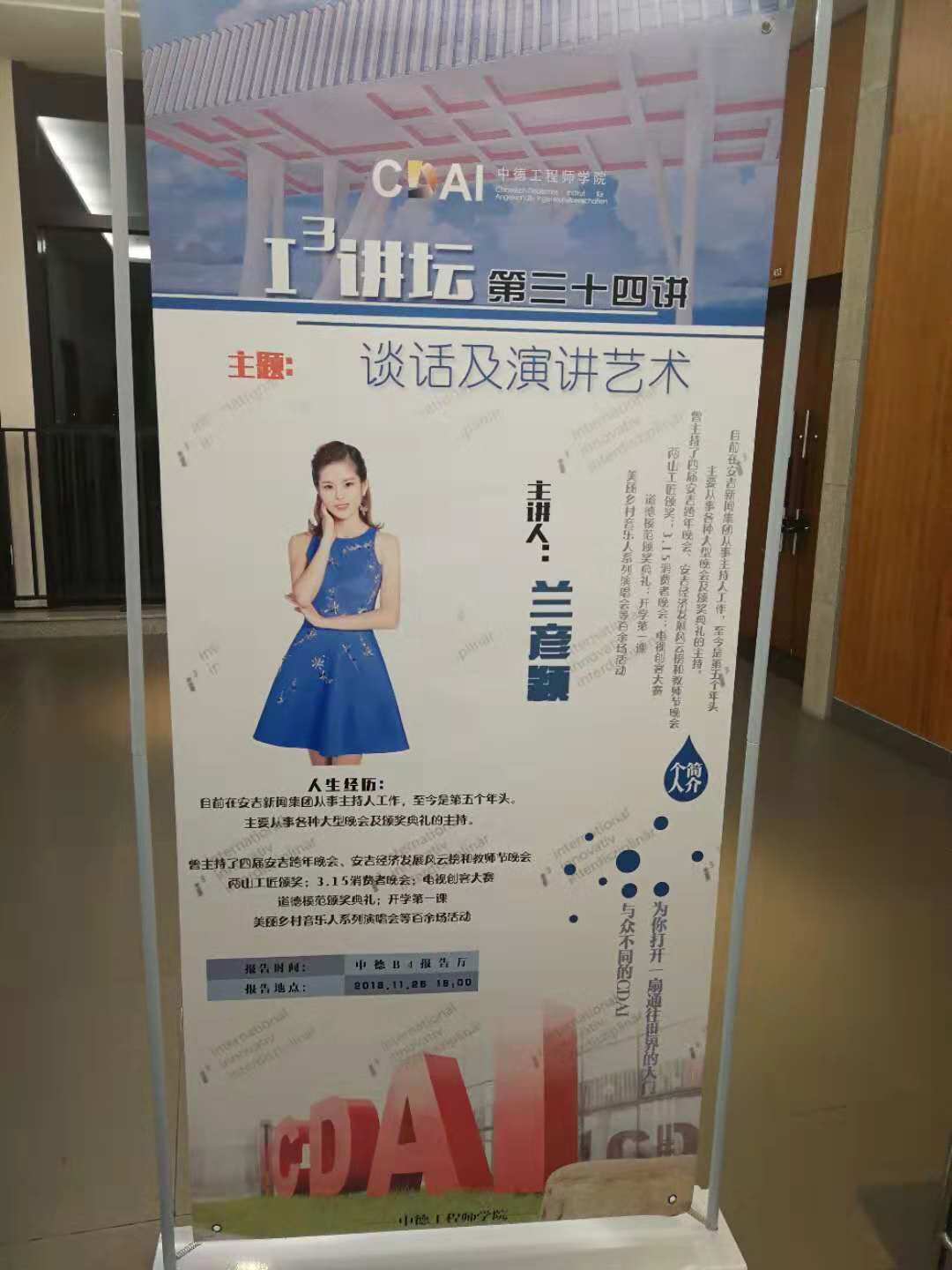 2018年11月26日18:00,DB彩票 18级全体同学齐聚中德楼B4报告厅,聆听由安吉新闻集团的主持人兰彦颖带来的主题为“谈话及演讲的艺术”的I³讲坛。