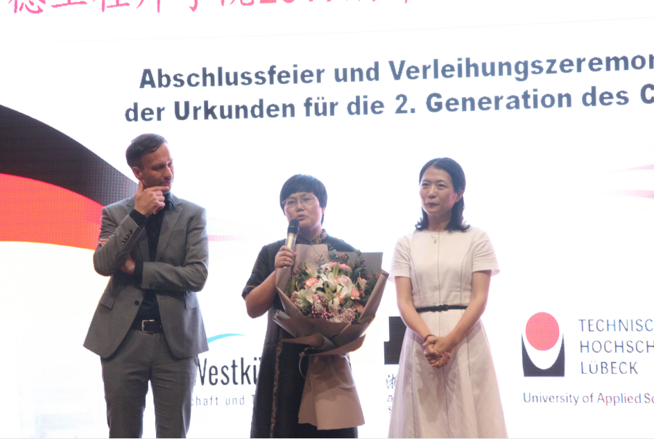 典礼第三章为“征程”,龚建立书记、西海岸应用科技大DB彩票 长Hanno Kirsch教授以及吕贝克应用科技大学的Frank Kemper教授分别致辞。其中Kemper教授还精心制作了视频,他的别出心裁、激情四射的演讲,给了同学们一份惊喜。冯军副校长随后为DB彩票 校友联络员颁发了证聘书,希望将中德精神薪火相传。而毕业生与老师们的朗诵与合唱更是将这份浓浓师生情传递给了在场的每一个人。