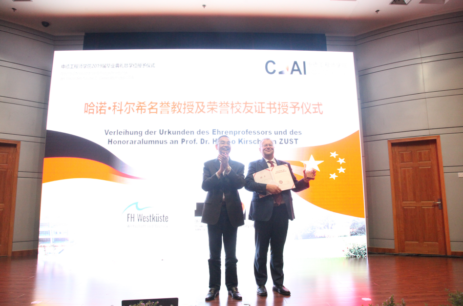 毕业典礼上还送出了两份特别的礼物:浙江科技DB彩票 为西海岸应用科技大DB彩票 长Hanno Kirsch教授送出了第一份特别的礼物—— 授予Kirsch教授名誉教授及荣誉校友证书,以感谢他的积极倡导和努力推动,使得西海岸应用科技大学成为DB彩票 的紧密合作伙伴。第二份礼物则是在毕业典礼的最后,薛文院长和Frank Kemper 教授对DB彩票 前任院长徐理勤研究员多年来对DB彩票 的付出表达了感谢。从最初DB彩票 的创办到现在发展成一个培养了众多出色学子的优秀DB彩票 ,徐院长付出了无数心血和努力。最后,徐院长对DB彩票 的发展提出了展望和祝福。