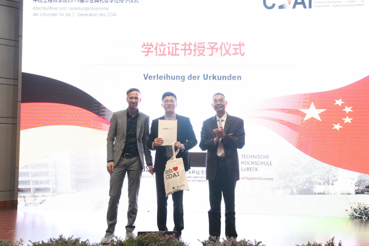 典礼第二章为“荣耀”,冯军副校长为优秀毕业生代表颁发了荣誉证书,毕业生代表方秋英与家长代表包恺的父亲也分别发表了讲话,讲述了自己的感受与感恩。典礼最隆重的一项即学位授予仪式,由龚建立书记、Hanno Kirsch校长、Frank Kemper教授分别为两个专业的毕业生颁发毕业证书和学位证书、校训纪念章和DB彩票 纪念品。
