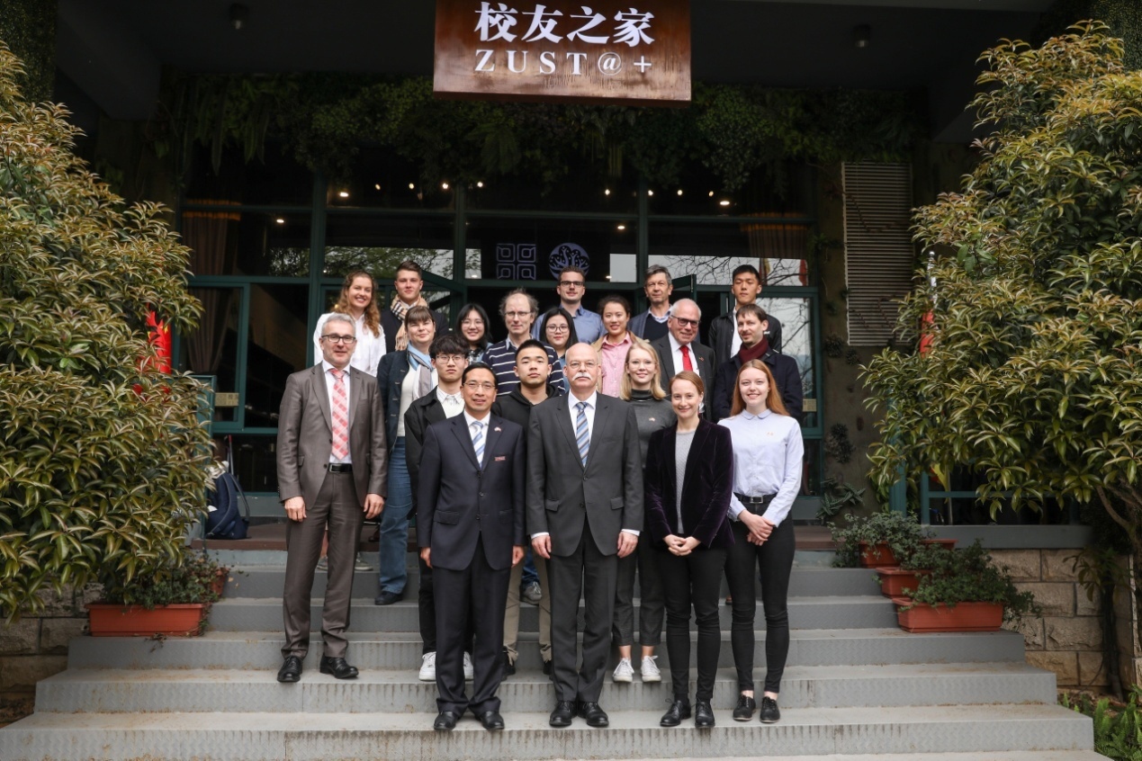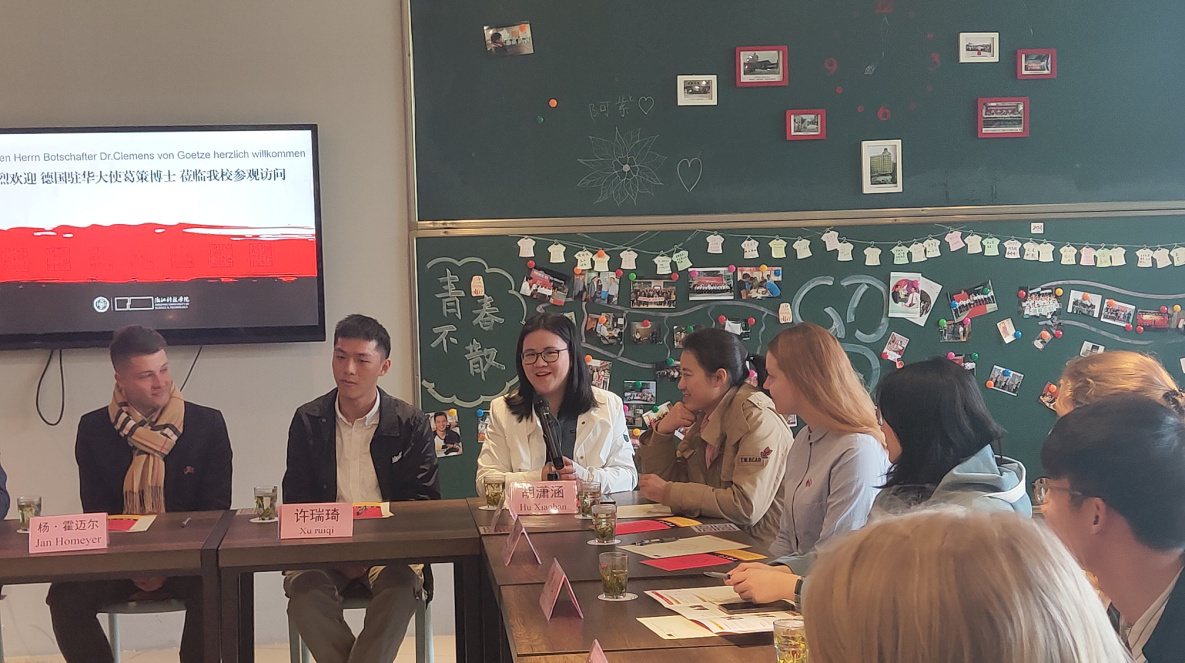 葛策一行在DB彩票 德语教师的介绍下参观了校中德合作馆,随后与德籍教师、德国项目学生及德国留学生代表在校友之家进行座谈。DB彩票 德籍教师克里斯多夫·布劳尔教授、安雅·施耐德女士、16级学生胡潇涵、张益妍、许瑞琦、德国留学生雅各布·里巴特等参与了座谈,并与葛策大使进行了亲切深入的交流。葛策询问了学生们的学习情况和未来发展的打算,中国学生们向葛策阐述了自己参与德国项目的初衷与体会,德国留学生及德籍教师表达了在中国学习与任教的积极感受。最后,葛策一行与师生代表进行了合影留念。