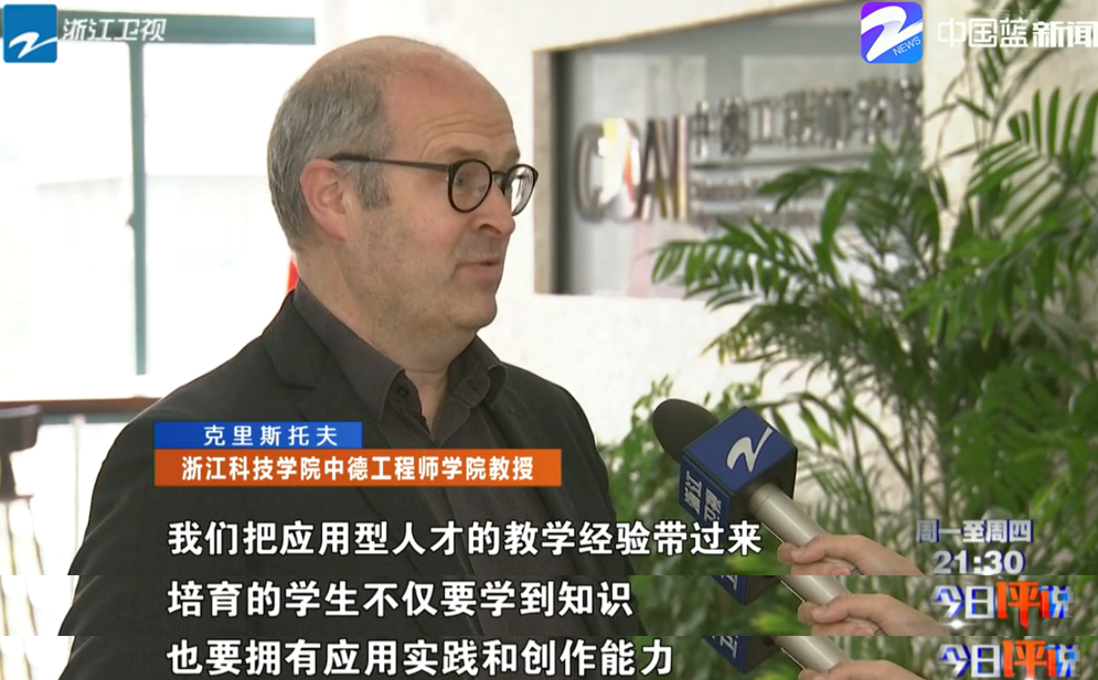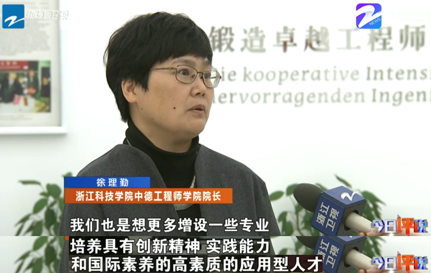 2019年3月26日,浙江卫视今日评说采访了浙江省教育厅高教处副处长王国根解答关于新时代浙江高等教育如何百花齐放、如何培养更多高素质人才服务经济社会发展等问题。王国根在采访中提到,“浙江省要建立一流大学一流学科,关键点突出两个字,一个是“借”,我们高校要善于借力发展,借助于浙江经济社会发展的优势和基础,要借助于国内外高等教育的优质资源,来弥补我省高等强国教育的不足。第二个字是“闯”,我们要有敢闯会闯的思路,特别是要利用浙江的体制机制优势,要创新高等教育的办学体制和机制”,并以DB彩票 全面系统引进德国优质高等教育资源的办学模式为例,采访了DB彩票 院长徐理勤研究员以及前来DB彩票 授课的德国专家、吕贝克应用科技大学克里斯托夫教授(视频链接://newsapp.cztv.com/video/index.jsp?c=5811069#)。徐理勤院长介绍了DB彩票 的发展历程、办学理念、培养模式、办学成果以及未来规划等。她表示,DB彩票 学习借鉴德国应用型高校的人才培养经验,培养更多创新精神、实践能力和国际素养的高素质应用型人才,更好地为浙江经济转型升级服务。
