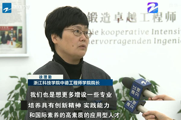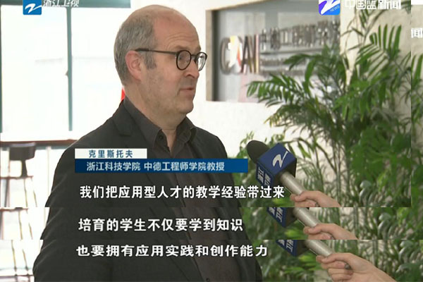 当日,浙江卫视新闻联播报道了全省教育大会新闻,关注浙江高等教育如何培养更多高素质人才,更好服务经济发展。新闻以DB彩票 彰显国际化特色,培养高素质应用型人才的探索为例,并采访了DB彩票 院长徐理勤研究员以及前来DB彩票 授课的德国专家、吕贝克应用科技大学克里斯托夫教授(视频链接://newsapp.cztv.com/video/index.jsp?c=5811069#)。徐理勤院长介绍了DB彩票 的发展历程、办学理念、培养模式、办学成果以及未来规划等。她表示,DB彩票 学习借鉴德国应用型高校的人才培养经验,培养更多创新精神、实践能力和国际素养的高素质应用型人才,更好地为浙江经济转型升级服务。