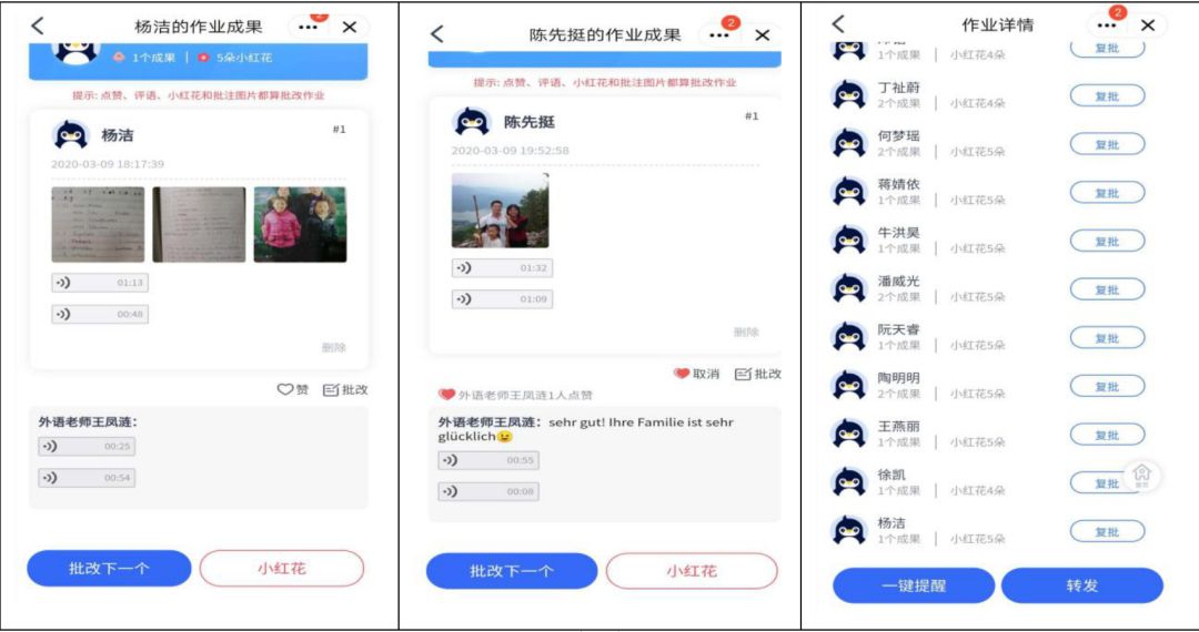 • 提升口语批改。口语作业要求学生以音频形式上传到老师助手中,教师在教师端可以进行以语音、评语、点赞、送花等形式实现同步批改,给学生第一时间的反馈。