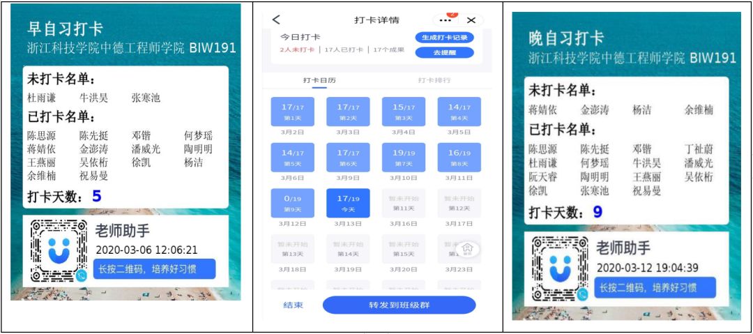 • 建立学习习惯。通过老师助手发布每日作业,同时为使学生保持早读及晚自习习惯,鼓励学生用老师助手打卡早读和晚自习,该行为加强了学生的自律性及对自我努力的认可感。