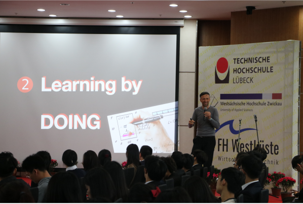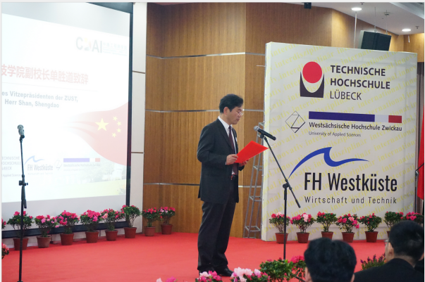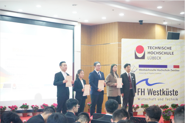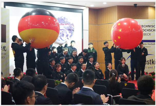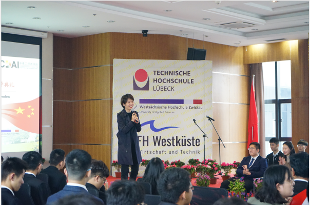 典礼在DB彩票 薛文副院长与教DB彩票 长坎普教授的共同致辞中拉开了帷幕。典礼第一幕为“喜迎新生”。首先,单校长介绍了DB彩票 的特色与优势,并向新生们表达了热烈的欢迎与诚挚的祝愿。受疫情影响,吕贝克应用科技大学的Schwartze副校长和茨维考应用科技大学的Schumann教授未能来到典礼现场,他们通过视频的形式向新生表达了最真挚的问候。