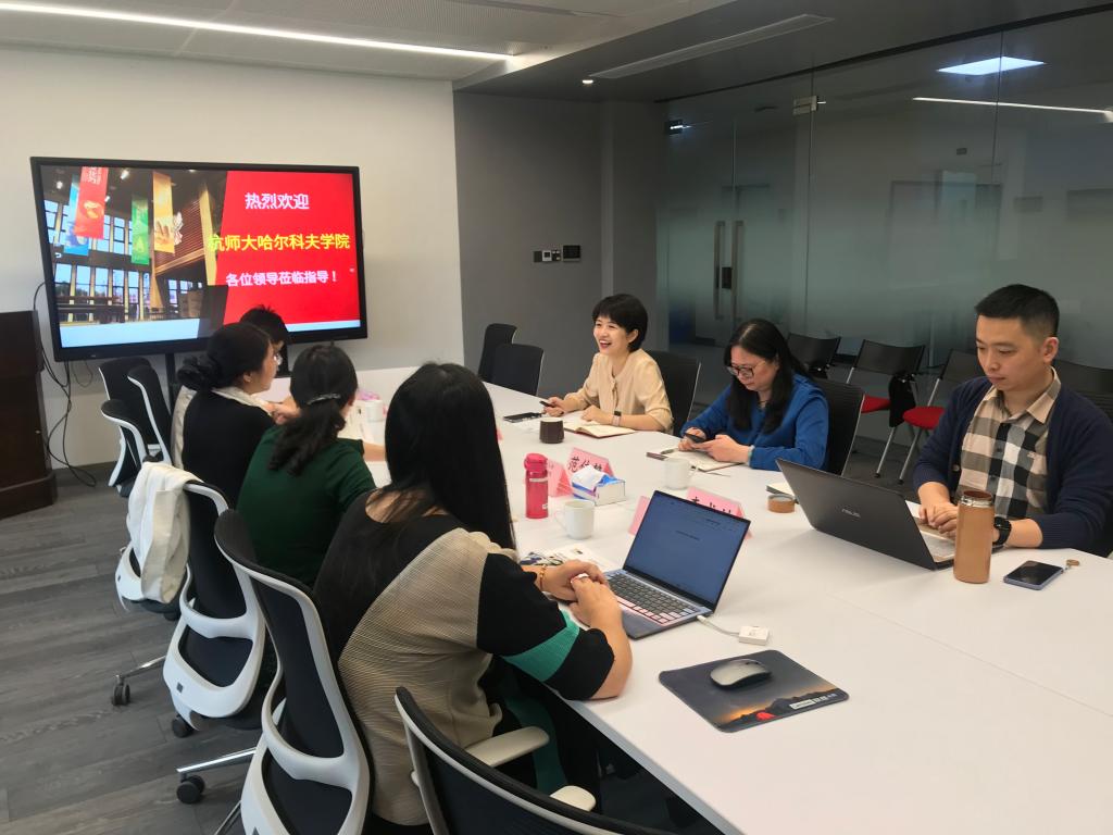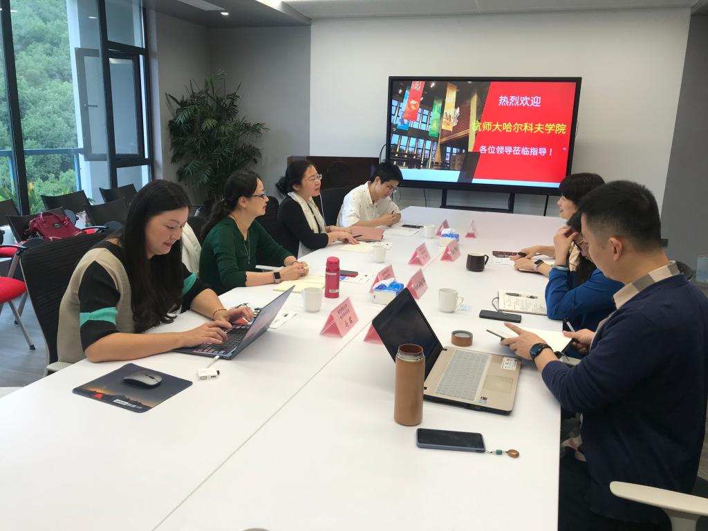 2021年10月15日上午,杭师大哈尔科夫DB彩票 院长欧荣、党总支书记徐凌芸、DB彩票 副院长胡潭高、党总支副书记马珺等一行五人来DB彩票 进行调研交流。DB彩票 院长薛文、直属党支部书记范佳静、副书记李成炜一同接待了来访人员。