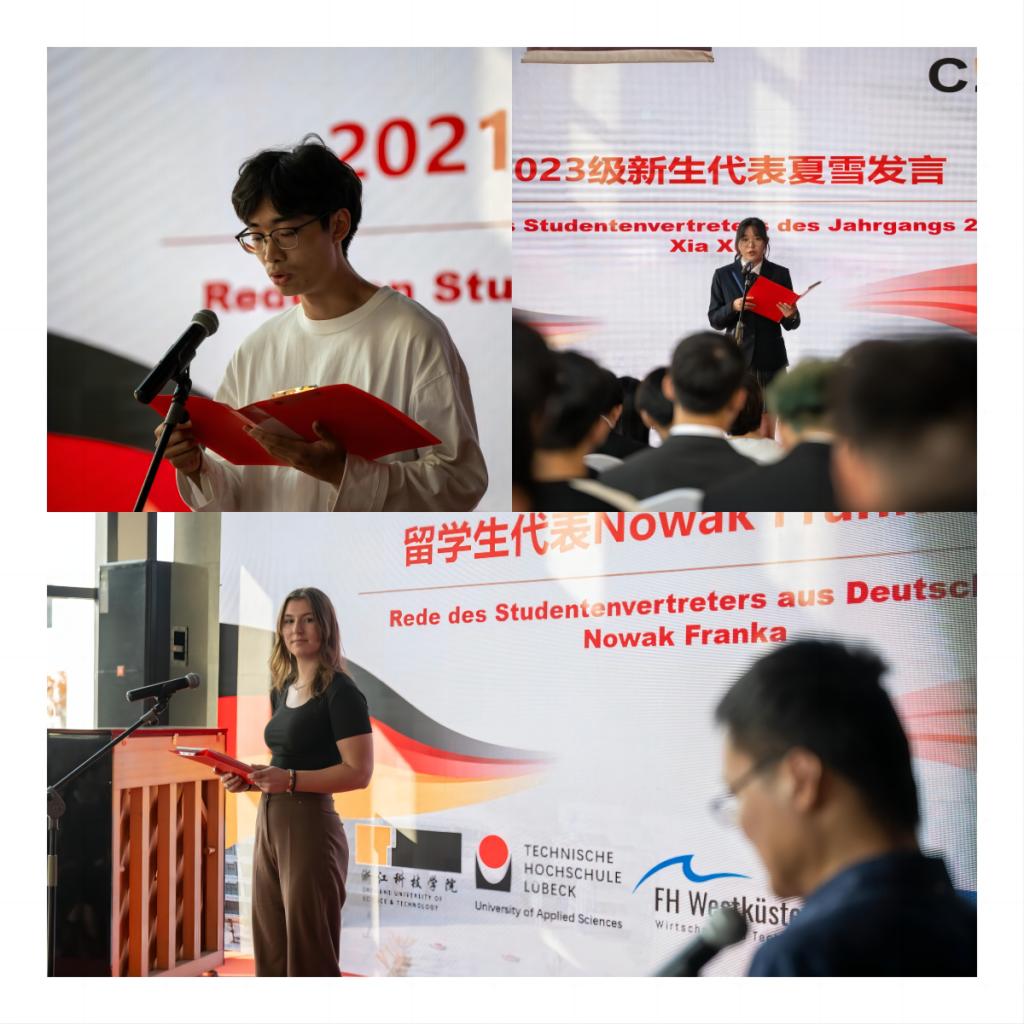 薛文院长致辞中表示,开学以来同学们朝气蓬勃、乐观开朗给人留下极其深刻的印象,她鼓励大家认清现实、用好资源、做好规划,走向更宽广的世界。德方专业负责人Jan Lüking教授希望大家对待专业学习保持好奇,期待在德国与大家相见。老生代表助班姚养正结合自身经历建议同学们尽快调整心态、做好个人规划、学好专业知识。新生夏雪谈到入校以来对土木工程和德语多了一份理性的思考,她认为要从学习上和生活上尽快适应环境并不懈努力。留学生代表Nowak Franka以自身从德国来中国交换为例,期待同学们能争取前往德国体验不同的文化。