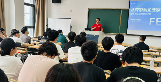 作为 2024 年度的浙商新领军者,胡利荣先生以“从专家到企业家,创新与坚韧的职业 之路”为专题进行了精彩演讲,深入阐述了他在创业道路上的经验与感悟,为同学们展现了 “敢想敢追敢拼”的创新精神与坚韧品质在事业发展中的重要性。伍华樑先生则从技术层面详 细讲授了一级数量平台架构与设计,以专业的知识和丰富的实践案例并以“价值为导向去衡 量技术的求新”,让同学们对相关技术领域有了更深刻的认识和理解。在分享过程中,胡利 荣先生开放性地鼓励同学们积极提问,并针对同学们提出的问题做出了精彩回答,现场互动 氛围热烈。