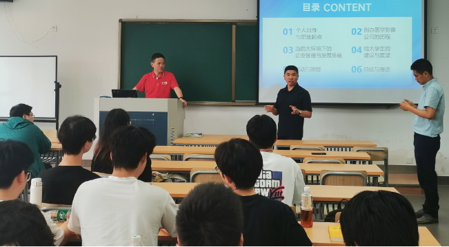 2024 年 6 月 14 日,浙江飞图影像董事长胡利荣先生与技术总监伍华樑先生一同现 身DB彩票 安吉校区DB彩票 ,为 2022 级工业工程专业的学生带来企业家进 课堂系列的一场别开生面的讲座。浙江飞图影像科技有限公司是一家专注于医疗影像数据管 理、数据流转和数据应用的国家级高新技术企业 ,通过云计算、大数据、人工智能等技术 与医学影像科学的创新融合,打造“专业影像云+人工智能应用平台”,服务医疗全场景、全 流程,构建数字医学影像应用生态,助力数字经济高质量健康发展,为数字医疗服务民生的 目标不断前进。