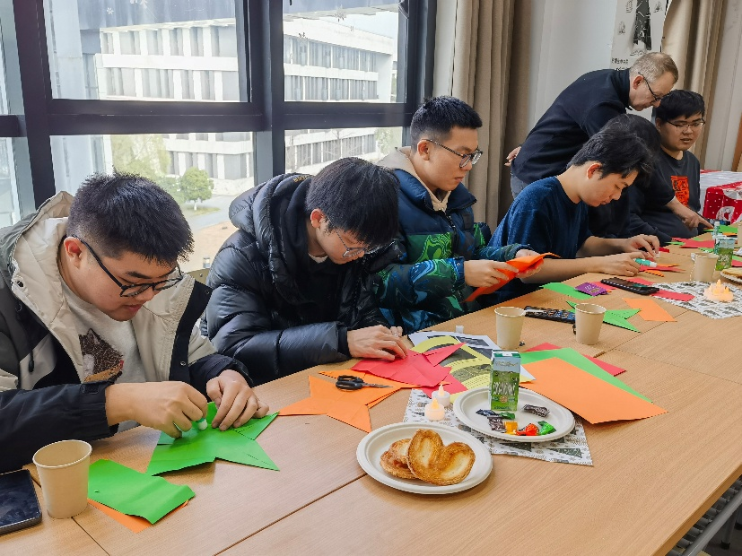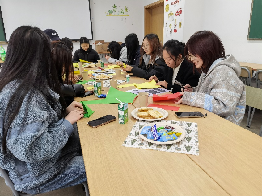在实践体验环节,学生们在外教的指导下,利用彩纸进行剪裁、折叠,制作富有冬季特色的窗饰和手工装饰。学生们一边动手操作,一边尝试使用德语进行交流,在真实语境中练习日常表达,现场氛围轻松而融洽。
