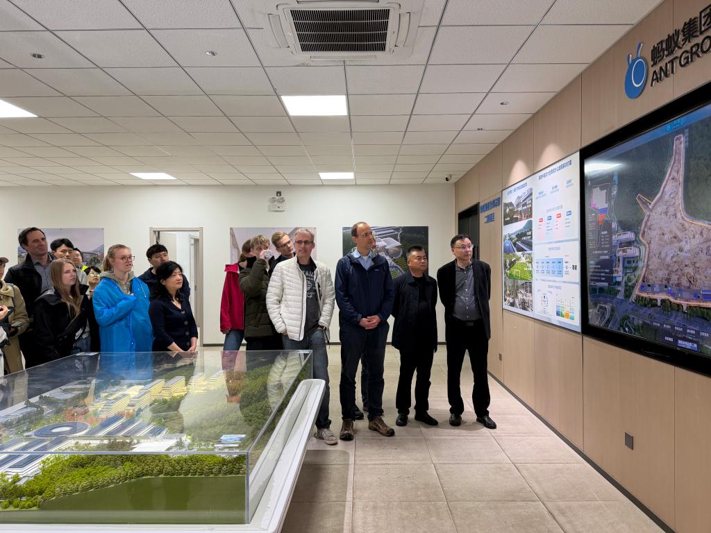 4月3日春令营团访问团转战杭州,走进由浙江省一建建设集团承建的蚂蚁全球总部二期项目。作为全球最大的近零能耗建筑之一,该项目秉持“和、绿、健、久”的设计思想,给师生们留下了深刻印象。在题为《深化中德学术交流 共筑智能建造未来》的报告中,项目团队详细展示了其在BIM技术应用智能施工方面的成果。从“工地天眼AI”到“无人机场”,从“混凝土地下连续墙机器人”到“外骨骼机器人”,一系列数字化管理装备的展示,生动诠释了中国建筑业向智能化、数字化转型的坚定步伐。