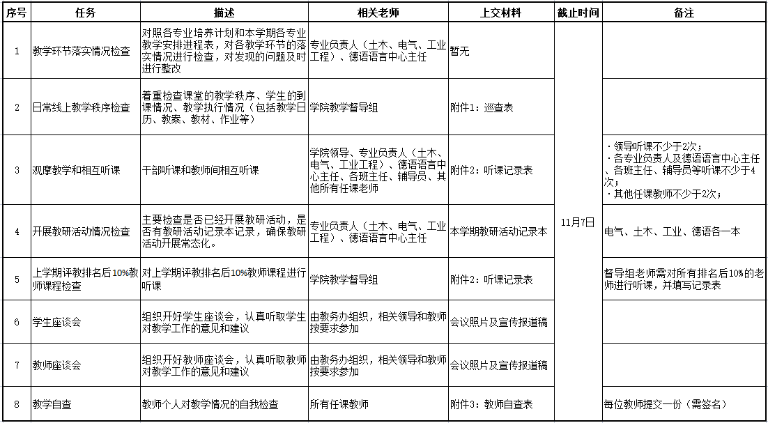 DB彩票 定于第8周、第9周(10月24日~11月4日)进行期中教学检查。现将DB彩票 期中教学检查任务分配如下表,请老师们按要求及时完成任务并将相关材料电子版发送至[email protected]