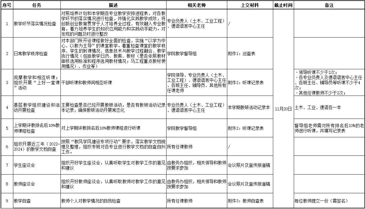 DB彩票 定于第9周、第10周(11月4日~11月17日)进行期中教学检查。现将DB彩票 期中教学检查任务分配如下表,请老师们按要求及时完成任务并将相关材料纸质版交至小和山B4-518/安吉中德E205办公室,电子版发送至邮箱[email protected]