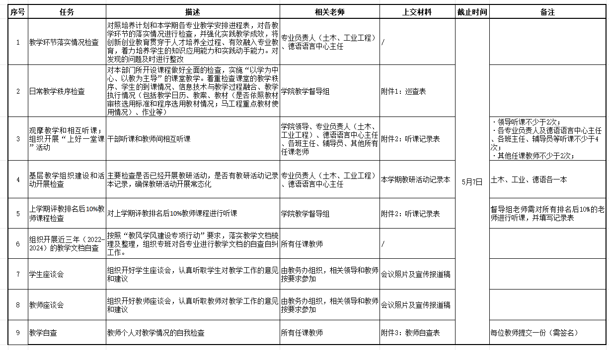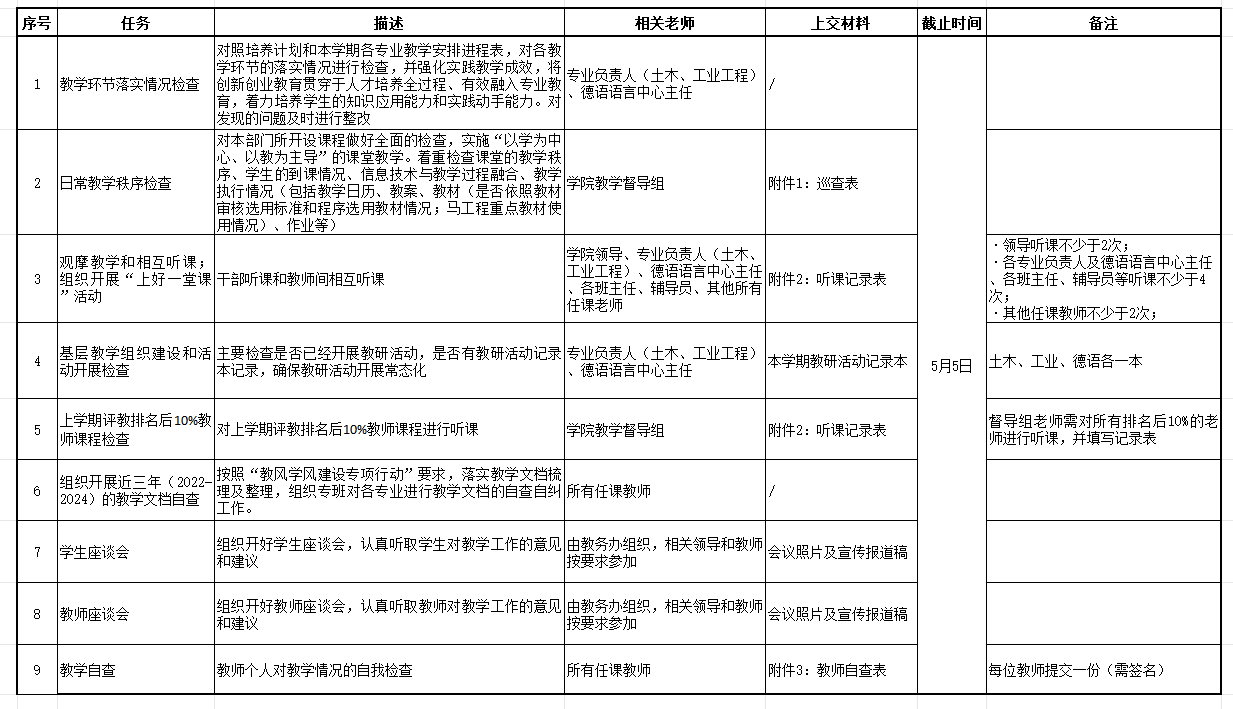 DB彩票 定于第9周、第10周(4月21日~5月2日)进行期中教学检查。现将DB彩票 期中教学检查任务分配如下表,请老师们按要求及时完成任务并将相关材料纸质版交至B4-518办公室,电子版发送至邮箱jw.dbbonus.net。