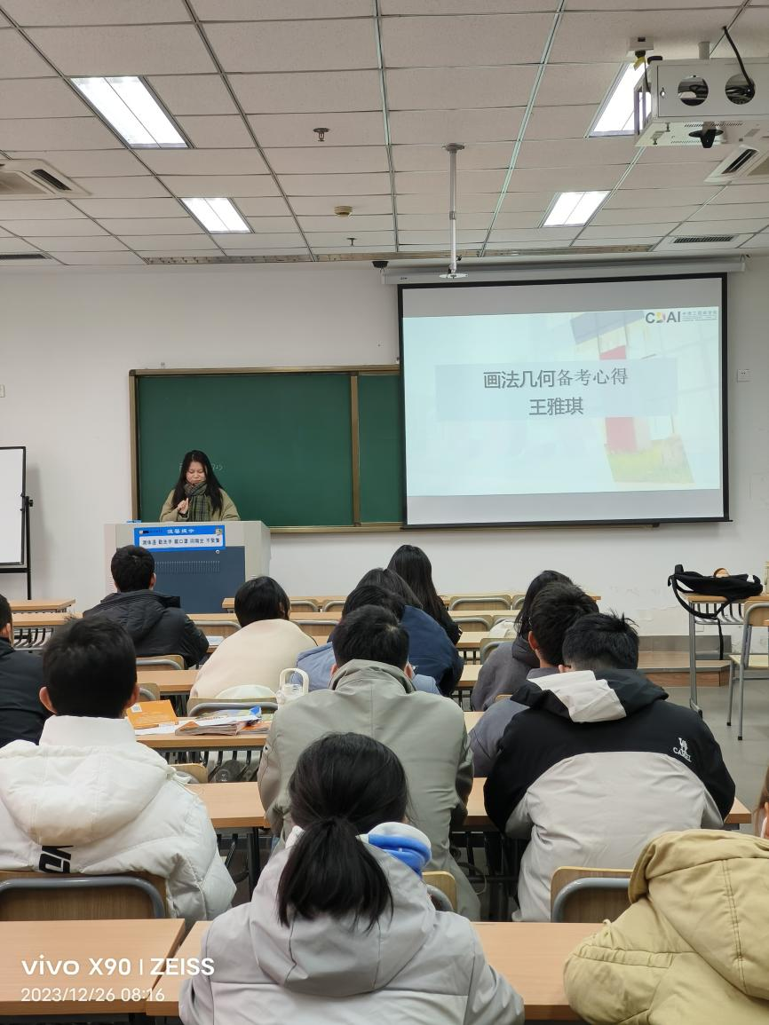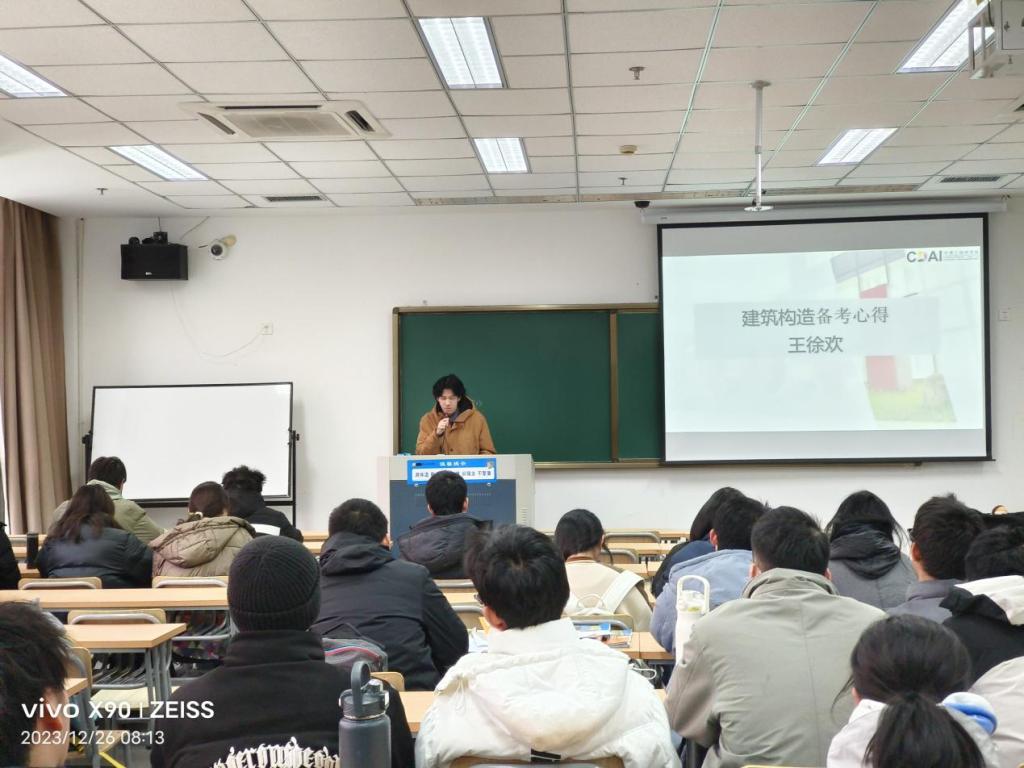 傅徐欢学长以“做题”为轴心,列举了工程数学“理解”“思路”“总结”“数量”的四个做题的要点,分享了视频自学、整理知识清单、通过例题强化公式和结论的运用等学习方法。童昕斌学姐通过举例为大家生动地展示了大学德语考试的流程与得分要点,并带来口试、听力、笔试中的不同复习技巧。王徐欢学长带来建筑构造备考心得,分别从笔试与口试为打击讲述建筑构造的应试技巧以及复习过程中可以做的准备。王雅琪学姐分别从cad考试难点、学习过程中的技巧为我们讲解了画法几何在各个方面的学习以及考试要领,列举了截交线和相贯线两个考试重点并强调“难题不慌”这一重要心态。翁敏亮学长讲解了静力学备考要点,通过例题的讲述强调了“做题”和“理解”的重要性,鼓励同学们找准自己的复习方法。最后学长学姐们分享了各自的联系方式,鼓励大家多多交流。