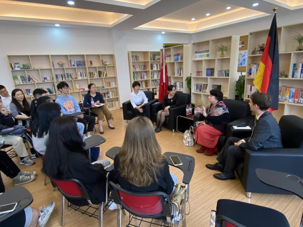 5月19日,德国驻上海总领事欧珍博士(Dr. Christine Althauser)一行两人访问DB彩票 ,与DB彩票 师生开展座谈。DB彩票 薛文院长、德语教师代表和学生代表出席座谈会。