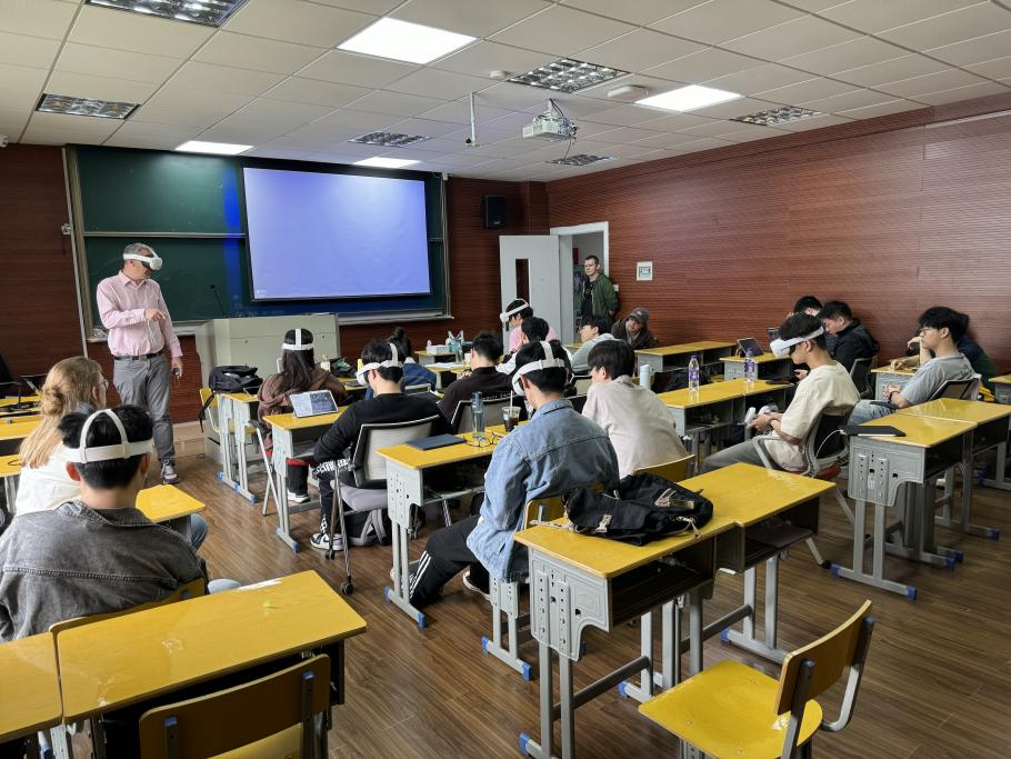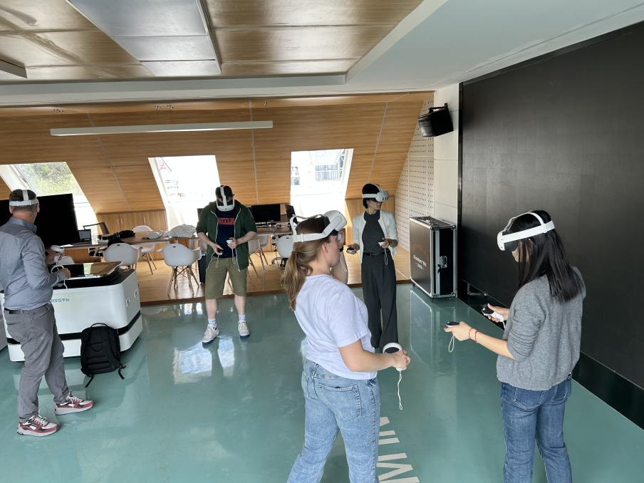 多年来,Elsche教授一直从事虚拟仿真相关教研项目,开发了土木工程虚拟教学场景,戴上VR眼镜即可在虚拟仿真的教学场景中跟随教授参观不同的结构模型,如屋架构造、楼板配筋等,参与人员在虚拟场景中以颜色区分身份,通过操控手柄飞行模式跟随听课。有别于DB彩票 数字建造实验室使用的VR眼镜,这次德方带来的眼镜属于升级版,不受上课场地限制,可以随时随地开展虚拟课堂。