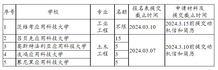 2024季交换生选拔将在20233-4月进行,本次选拔涉及院校、截止时间详情见下表。报名以收取报名表为准,纸质或电子版均可,纸质材料请交至B4-516谭老师处,电子版请转为PDF文档并发送至120063@dbbonus.net
